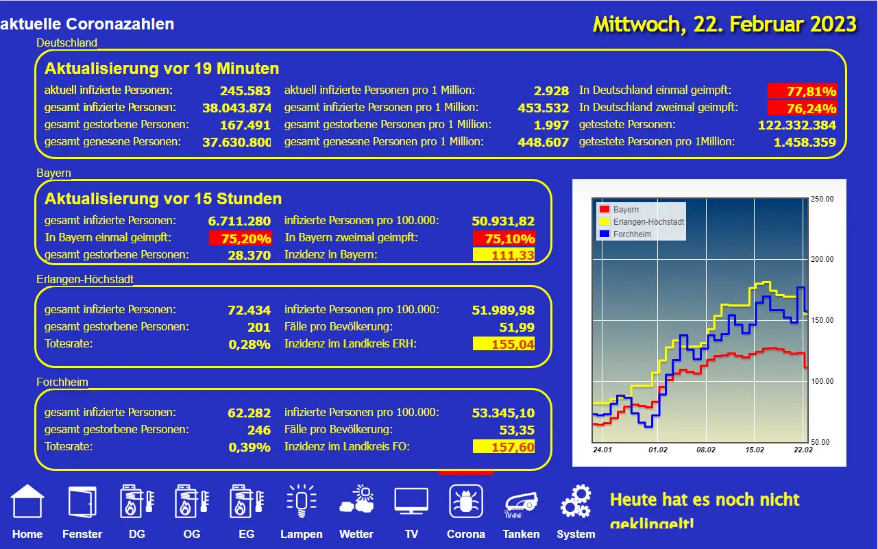Nachdem wir offenkundig die Corona-Zeit überwunden haben, ist es nicht mehr notwendig auf meinem Dashboard die Corona-Zahlen anzuzeigen. Da kam mir eine neue Idee.