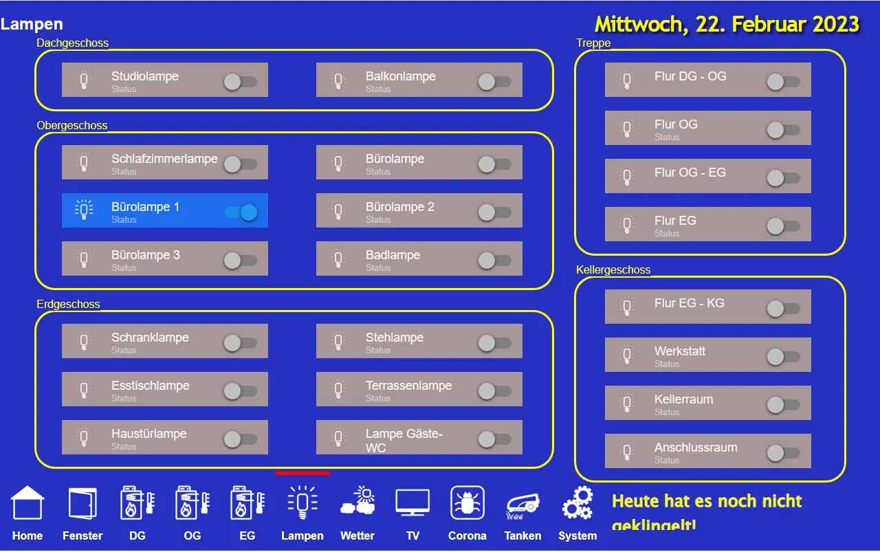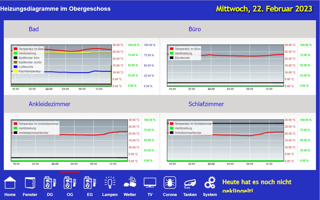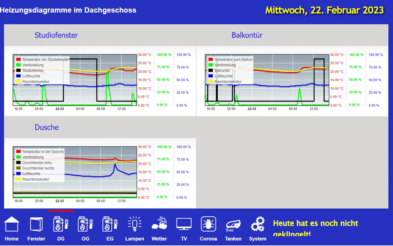 Die Umsetzung meines Projektes war bisher sehr arbeitsintensiv und ich habe mich wieder an der Seite smarthome-tricks.de orientiert. Wenn man sich schon mal die Arbeit macht, möchte man natürlich das Dashboard noch für weitere Informationen nutzen, die das genannte System möglich machen. Als Zielsetzung wollte ich Informationen zu folgenden Punkten realisieren: