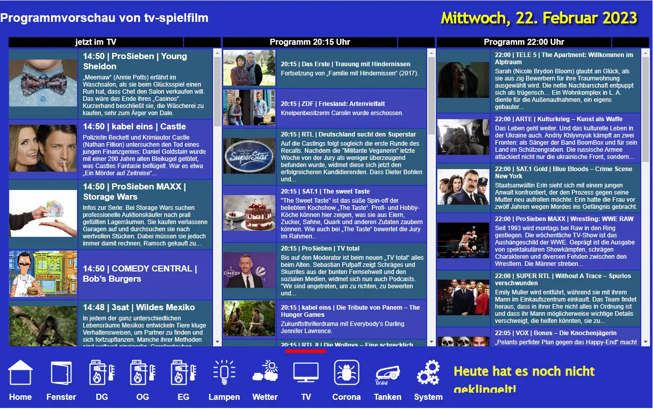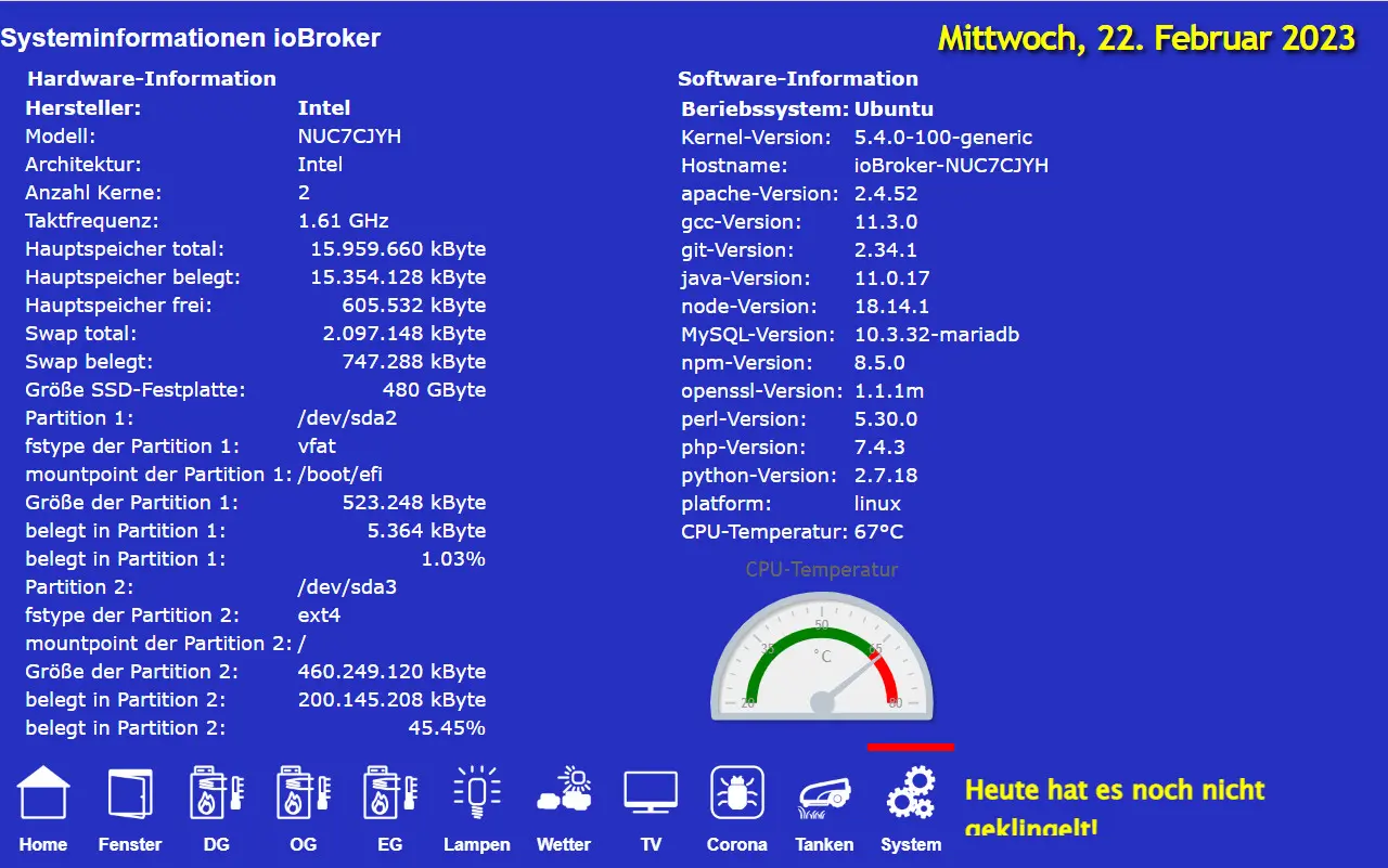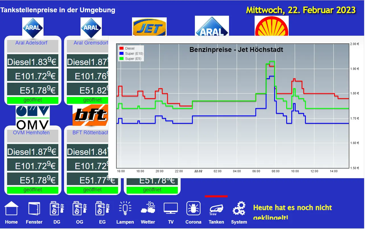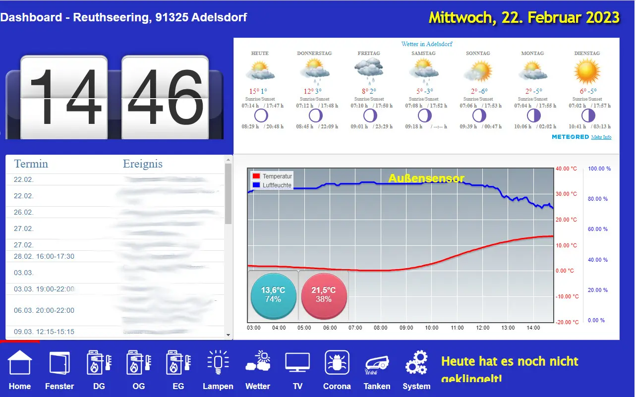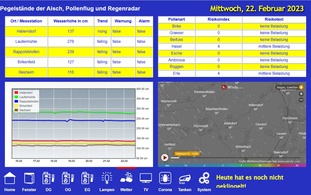 Kalender mit den Terminen, Wetterprognose, Pegelstände der Aisch in der Umgebung, Übersicht des Pollenflugs, Außentemperaturverlauf, Übersicht und Steuerung alle Heizungsthermostate, Zustand der Fenster-/Türkontakte, Temperaturverläufe für alle 3 Etagen, Steuerung diverser Lampen, Fernsehprogramme, diverse Corona-Zahlen, aktuelle Benzin- und Diesel-Preise in der Umgebung und diverse Systemeigenschaften.