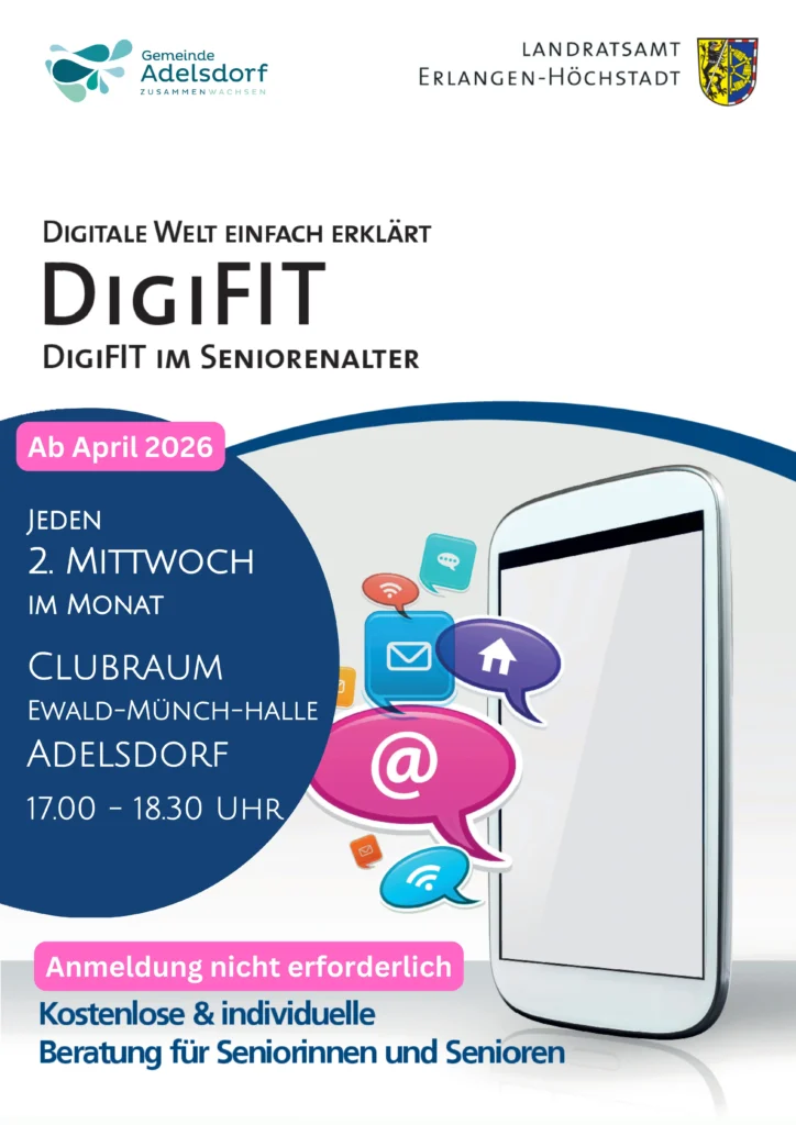 Von Januar 2026 bis März 2026 steht die Aischgrundhalle wegen den Bauarbeiten nicht zu Verfügung. Diese Termine werden im Rathaus, Sitzungssaal 2. Stock, Rathausplatz 1, 91325 Adelsdorf statt finden.